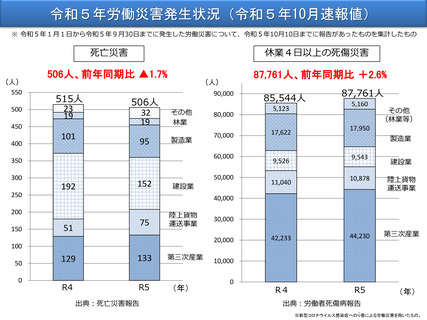 | 出典情報 | 令和5年における労働災害発生状況について(令和5年10月速報値)(10/19)《厚生労働省》 |