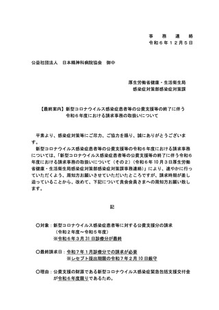 【最終案内】新型コロナウイルス感染症患者等の公費支援等の終了に伴う令和6年度における請求事務の取扱いについて