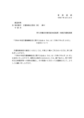 介護保険最新情報Vol.1376 「令和6年度介護報酬改定に関するQ&A(Vol.14)(令和7年4月18日)」の送付について