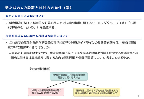 | 出典情報 | 第4期特定健診・特定保健指導の見直しに関する検討会 健康増進に係る科学的な知見を踏まえた技術的事項に関するワーキング・グループ(第1回 4/26)《厚生労働省》 |