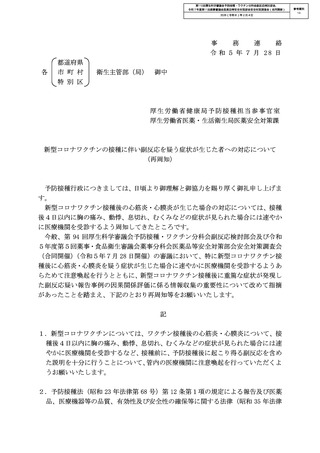 参考資料 14 新型コロナワクチンの接種に伴い副反応を疑う症状が生じた者への対応について(再周知)(令和5年7月 28 日付け厚生労働省健康局予防接種担当 参事官室及び厚生労働省医薬・生活衛生局医薬安全対策課事務連絡)[1.3MB]