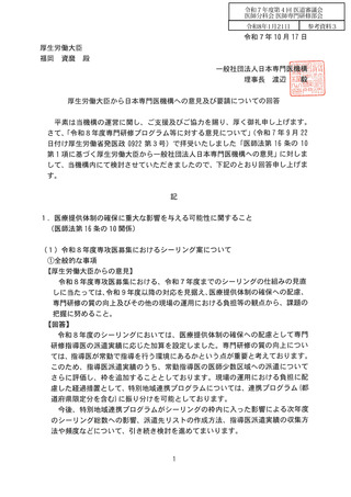 参考資料3 令和8年度専門研修プログラム等に対する厚生労働大臣から日本専門医機構への意見及び要請についての回答