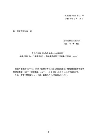 | 出典情報 | 令和8年度(令和7年度からの繰越分)医療分野における業務効率化・職場環境改善支援事業の実施について(2/13付 通知)《厚生労働省》 |