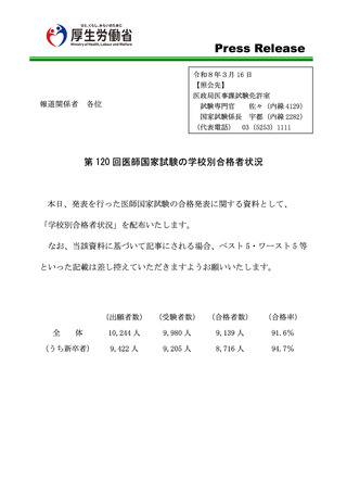 | 出典情報 | 第120回医師国家試験の合格発表について(3/16)《厚生労働省》 |