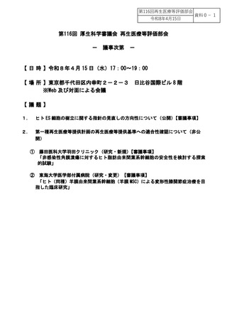 | 出典情報 | 厚生科学審議会 再生医療等評価部会(第116回 4/15)《厚生労働省》 |