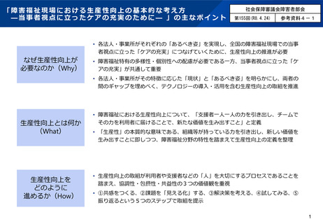 参考資料4-1 「障害福祉現場における生産性向上の基本的な考え方-当事者視点に立ったケアの充実のために-」の主なポイント