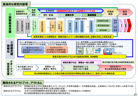 援や基盤整備を推進し、創薬シーズの早期実用化を図る。また、創薬基盤技術等の開発や希少疾病用