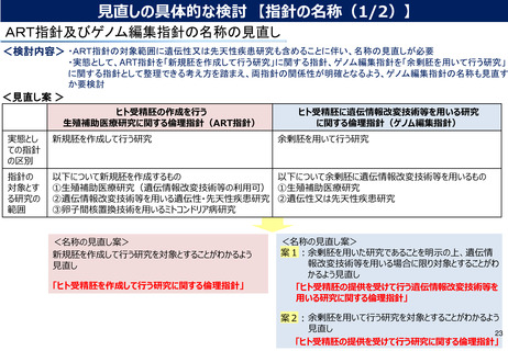 | 出典情報 | ヒト受精胚等へのゲノム編集技術等を用いる研究に関する合同会議(再設置第3回 11/7)《厚生労働省》《文部科学省》 |